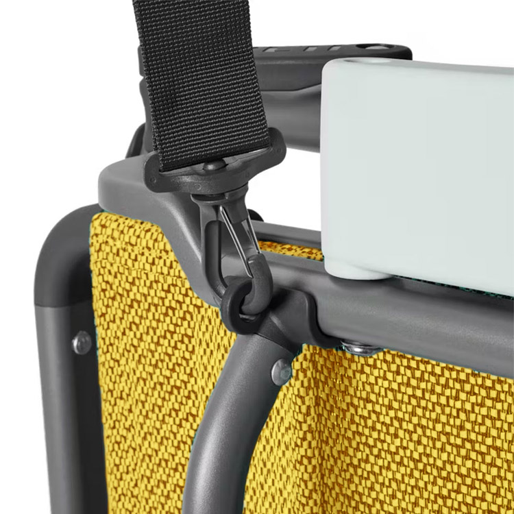 Вклучува издржлива, лесна торба за носење со лента за на рамо за лесен транспорт. Кога е преклопен, столот одржува тенок профил кој совршено се вклопува во багажникот на автомобилот и во преградите за складирање.