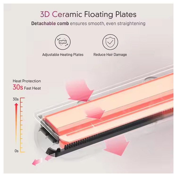 Овој пегла користи инфрацрвена топлина за нежно да навлезе во вратилото на косата, загревајќи ја косата од внатре кон надвор. Ова го минимизира оштетувањето на површината додека ја задржува влагата, што резултира со помазна, посјајна коса со подобрена цврстина и еластичност.