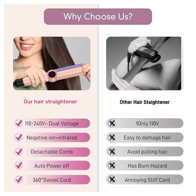 Широки плочи за пегла за коса со високи перформанси Рамно железо. Инфрацрвен пегла за коса со високи перформанси со широки керамички плочи од 1,3 инчи и технологија со негативен јон. Овозможува мазен стил без пржење со рамномерна дистрибуција на топлина. Идеален за густа, виткана или тешко управувана коса. Професионални резултати дома.