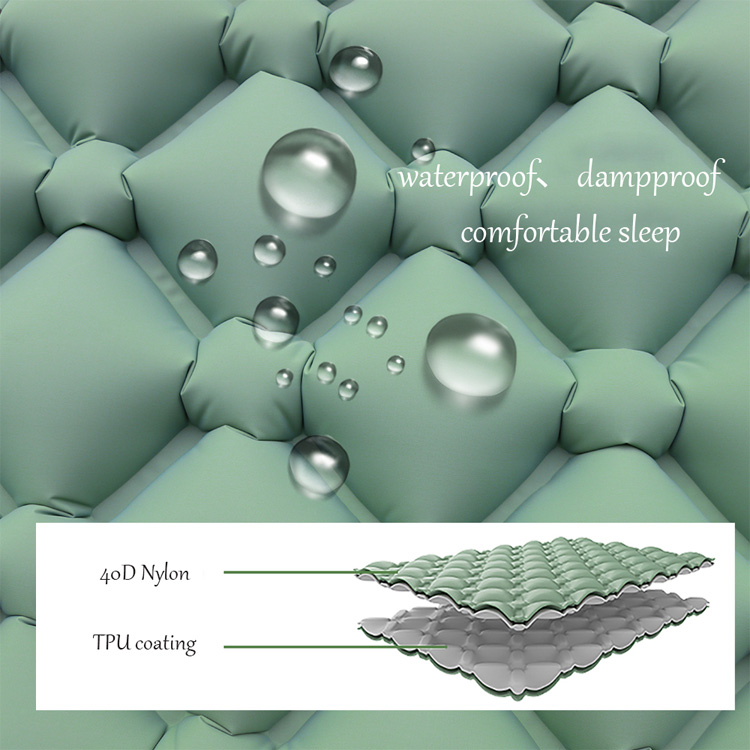 Лесен најлонски материјал за преклопен шатор за спиење. Вашето врвно преносно решение за спиење за авантури на отворено. Овој ултралесен душек на надувување има надувување со едно притискање и интегриран дизајн на перница. Изработен од издржлив најлон материјал, тој обезбедува врвен комфор за пешачење и кампување, обезбедувајќи мирни ноќи насекаде.