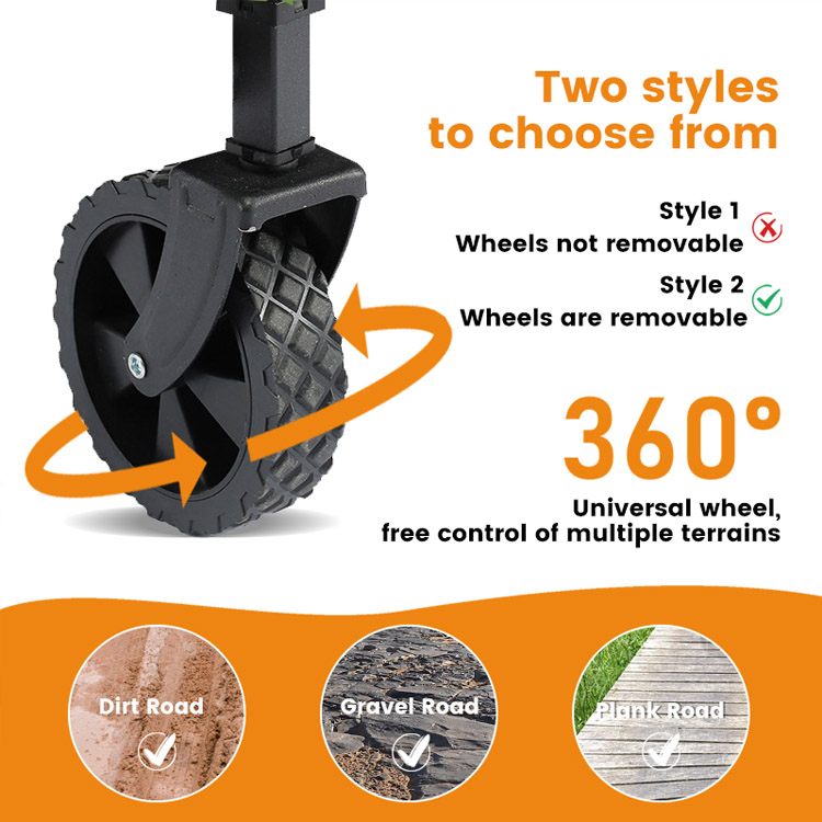 Опремен со пневматски гуми од 8 инчи со длабоки шари на шарите кои непречено се движат по песок, чакал, трева и нерамни патеки, истовремено обезбедувајќи стабилно движење и лесно маневрирање.
